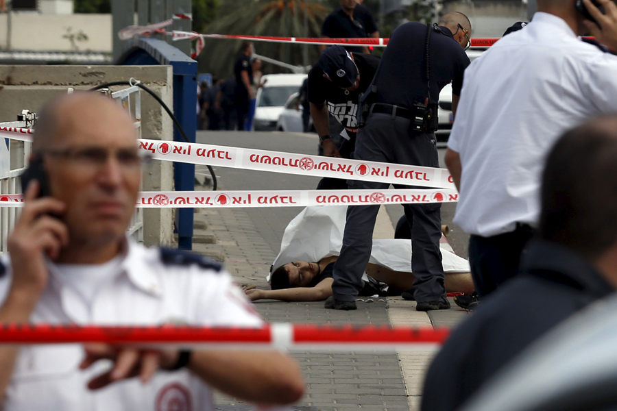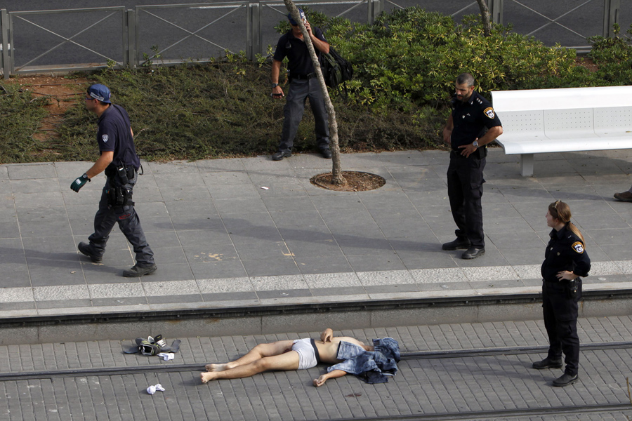 The body of a suspected stabber lies on the street after he was killed by an Israeli soldier in Tel Aviv, Israel, on October 8, 2015. Four people, including an Israeli soldier, were stabbed and wounded near a military headquarters in Tel Aviv, police and ambulance sources said, as a rash of such Palestinian attacks spread to Israel's commercial capital. The assailant was shot and killed by another soldier as he fled, a police spokeswoman said.Baz Ratner / Reuters