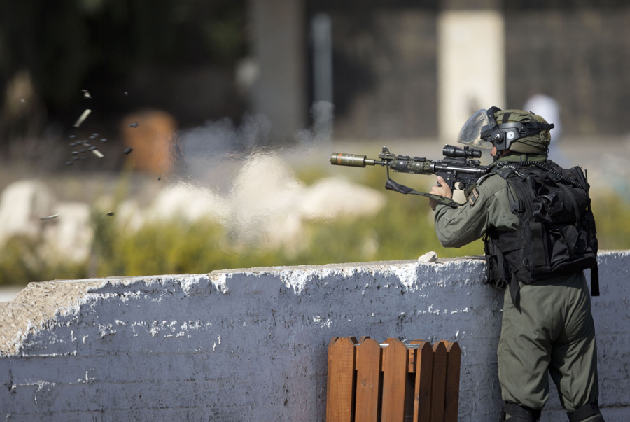 An Israeli shoots his weapon at a gun range near the West Bank Jewish settlement of Givat Zeev on October 11, 2015. Jerusalem’s mayor, caught on video last week with a gun slung over his shoulder while visiting a Palestinian neighborhood, made no apologies Friday for the display of force. He said he's helping keep his city safe. Store owners have said sales of guns and pepper spray are soaring.Dan Balilty / AP