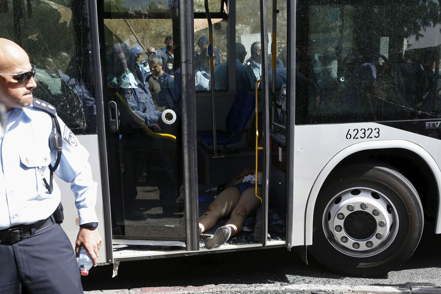 An Israeli police officer stands near a body aboard a bus after an attack in Jerusalem on October 13, 2015. Palestinian men armed with knives and a gun killed at least two people and wounded several others in a string of attacks in Jerusalem and a Tel Aviv suburb on Tuesday, police said, on a “Day of Rage” declared by Palestinian groups. Two Palestinians shot and stabbed passengers on a Jerusalem bus, killing one and injuring five, Israeli media reported. One of the assailants was killed, an ambulance service spokesman said, and the other captured.Ronen Zvulun / Reuters