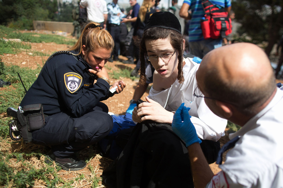 An ultra-Orthodox Jewish teenager is treated by a medical team after he was stabbed by a Palestinian man in Jerusalem on October 9, 2015. An 18-year-old Palestinian was arrested after the 16-year-old Jewish teenager was stabbed near a main road separating Orthodox Jewish neighborhoods from Palestinian districts, police said.Menahem Kahana / AFP / Getty