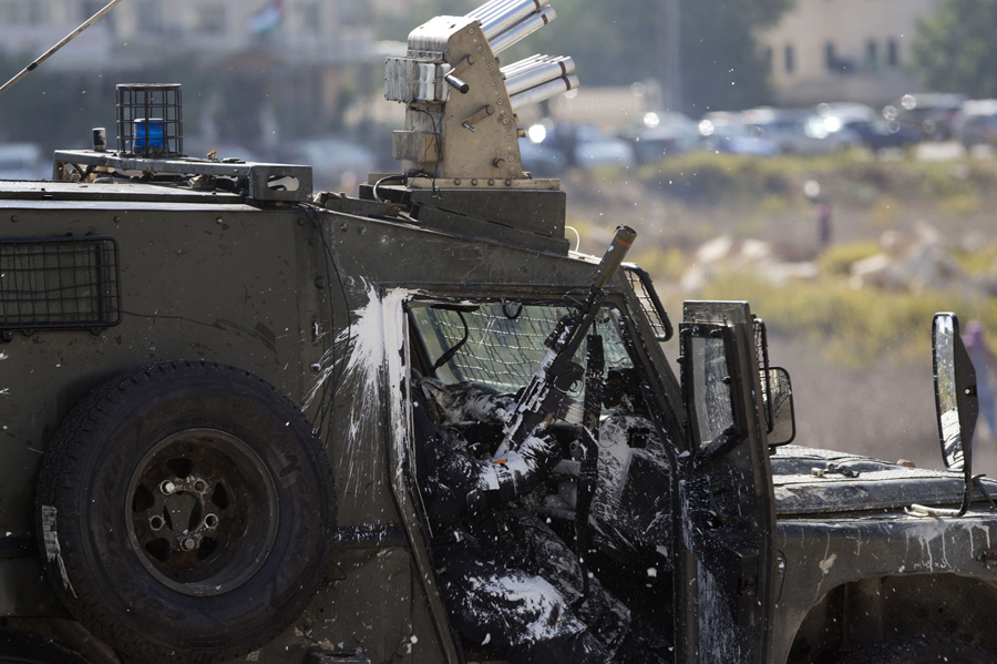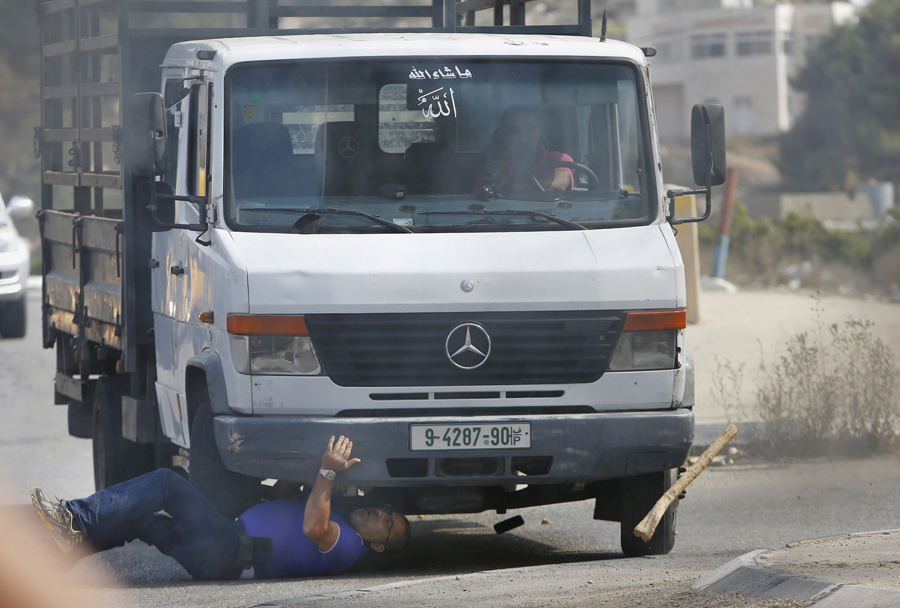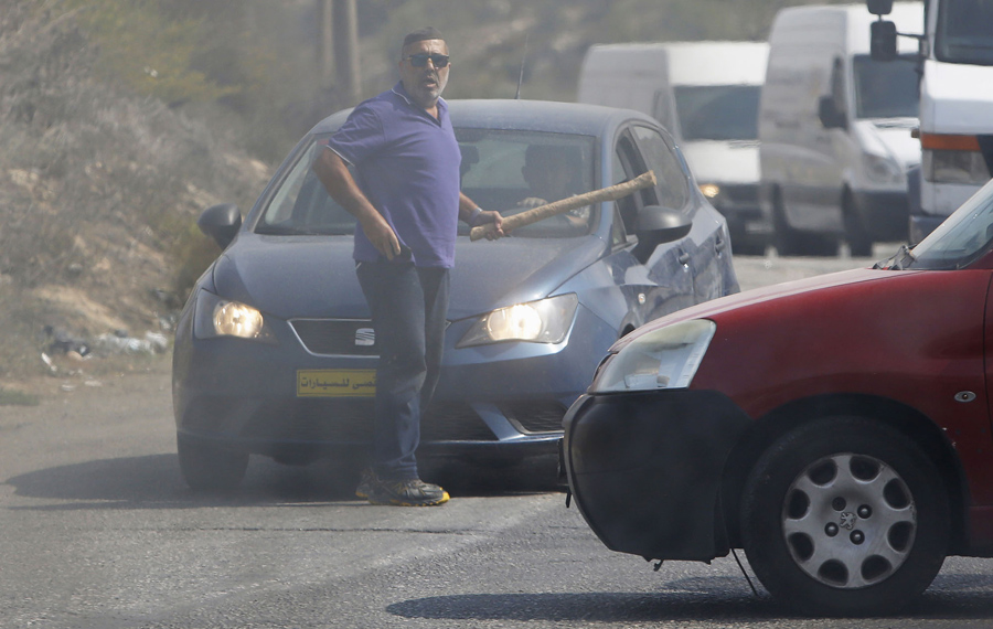 (1 of 6) An Israeli motorist holds a club before he was struck by a Palestinian vehicle in the West Bank city of Hebron on October 20, 2015. A Palestinian vehicle ran over and killed the Israeli motorist, who, a Reuters photographer said, was using a club to hit Palestinian protesters and cars on a roadside in the Israeli-occupied West Bank. Israeli police said the man had stopped his car after stones were thrown at it. The driver of the Palestinian vehicle, which the photographer said the Israeli had hit with his club, later turned himself in to Palestinian police. Neither they nor Israeli police commented immediately on whether they believed he had struck the Israeli deliberately.Mussa Qawasma / Reuters