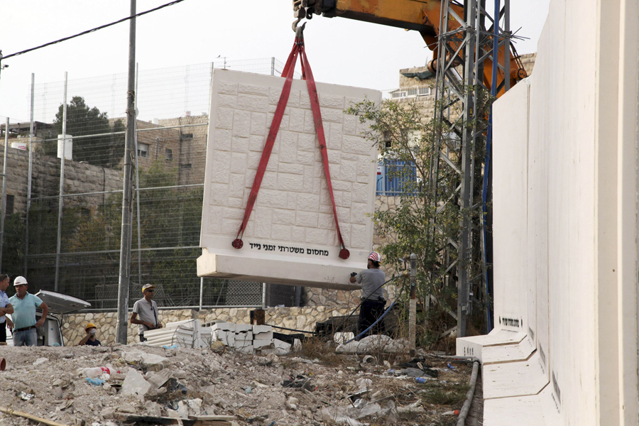 Workers unload a part of the wall being built between Palestinian and Jewish neighborhoods in Jerusalem on October 18, 2015. Palestinians in Jerusalem, more than one-third of the city's population, have awoken to a new reality: Israeli troops are encircling Arab neighborhoods, blocking roads with cement cubes the size of washing machines, and ordering some of those leaving on foot to bare their torsos to prove they not carrying knives.Mahmoud Illean / AP