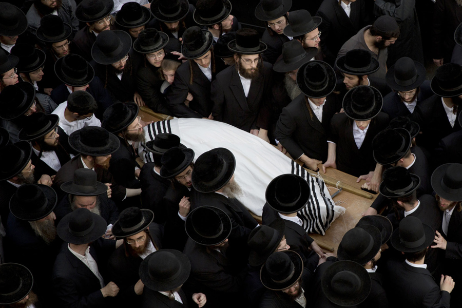Ultra-Orthodox Jewish men gather around the body of Yeshayahu Kirshavski during his funeral in Jerusalem on October 13, 2015. A pair of Palestinian men boarded a bus in Jerusalem and began shooting and stabbing passengers, while another assailant rammed a car into a bus station before stabbing bystanders, in near-simultaneous attacks.Oded Balilty / AP