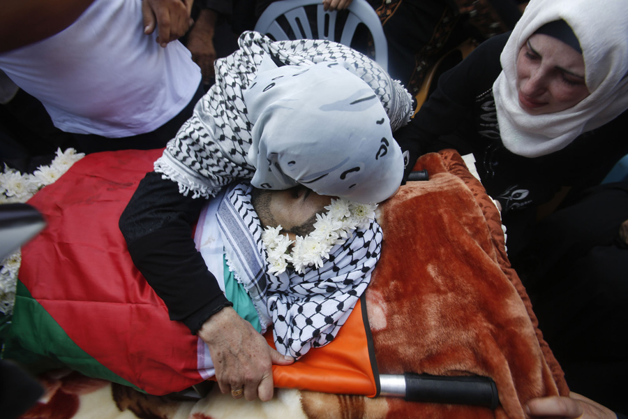 A relative hugs the body of Iyad Awawdeh, 26, during his funeral in the West Bank village of Dora, near Hebron, on October 17, 2015. Awawdeh was killed after he stabbed an Israeli soldier while posing as a journalist during clashes the day before.Nasser Shiyoukhi / AP