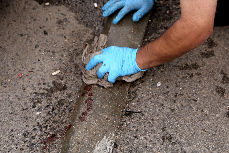 Israeli Zaka volunteers clean up bloodstains at the site where a 19-year-old Palestinian man stabbed a 25-year-old Jewish man in Jerusalem on October 8, 2015, during a spate of knife attacks, defying Israeli attempts to contain escalating violence.Gali Tibbon / AFP / Getty