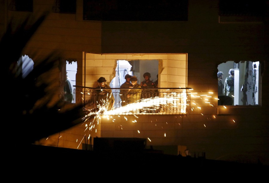 Israeli soldiers destroy the apartment of jailed Palestinian militant Maher al-Hashlamoun during a raid in the West bank city of Hebron October 20, 2015. In the southern West Bank town of Hebron, the army said Israeli forces destroyed an apartment that belonged to the Palestinian militant, who killed an Israeli near a West Bank settlement last year.Mussa Qawasma / Reuters