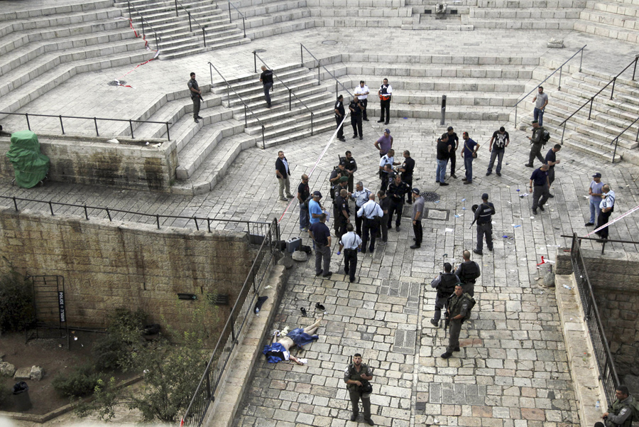 Israeli police stand near the body of a Palestinian who, according to the police, stabbed two police officers before other police forces opened fire and killed him, but also wounded one of their own, at the Damascus Gate of Jerusalem's Old City on October 10, 2015.Mahmoud Illean / AP
