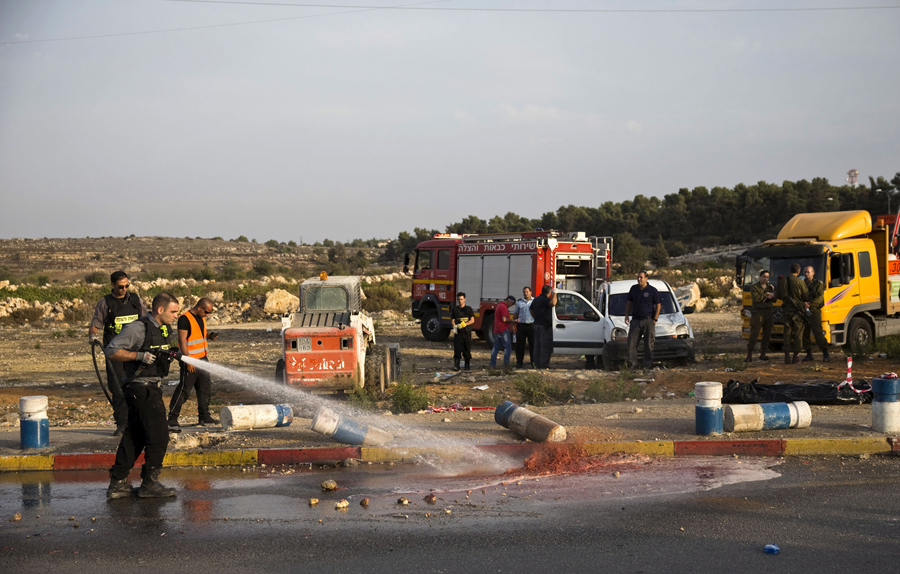 An Israeli firefighter uses a hose to clean the scene where a Palestinian man, suspected of carrying out a running over and stabbing attack, was shot dead near the West Bank Jewish settlement of Efrat, part of the Gush Etzion bloc, on October 20, 2015. The man rammed his car into a bus stop near an Israeli settlement in the West Bank, injuring two people, the Israeli military said. According to the military, the man then got out of the vehicle and tried to stab people before being shot by security forces.Ronen Zvulun / Reuters