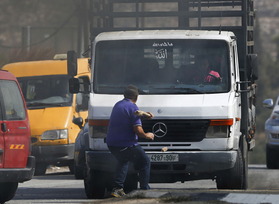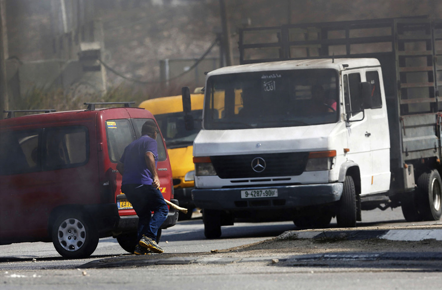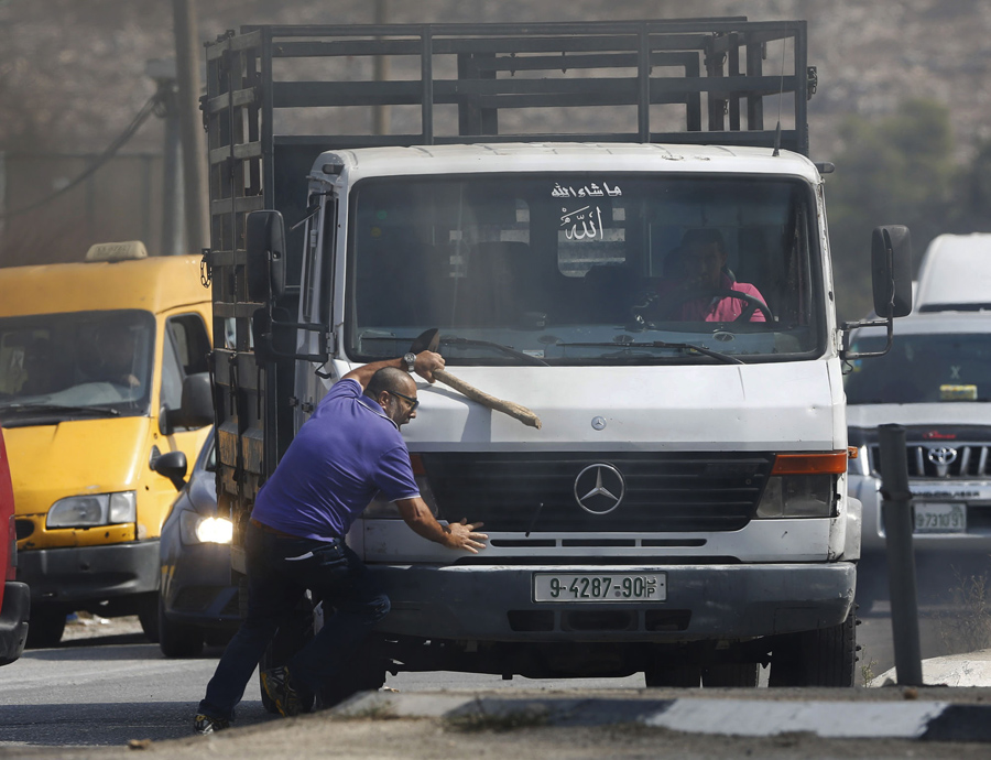 (2 of 6) An Israeli man with a large stick approaches a truck driven by a Palestinian man at the Al Fawar junction near the West Bank city of Hebron on October 20, 2015.Nasser Shiyoukhi / AP