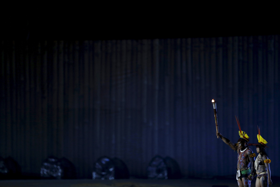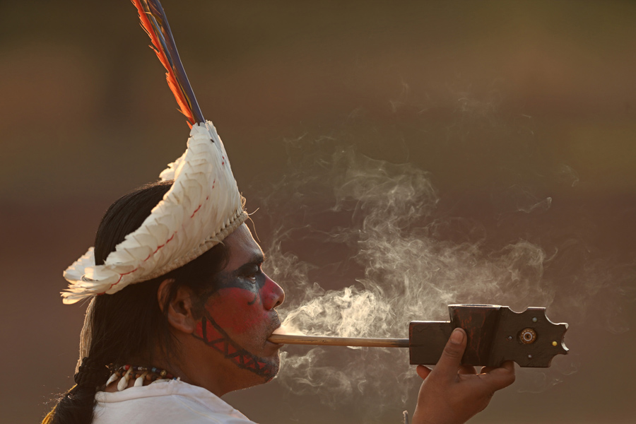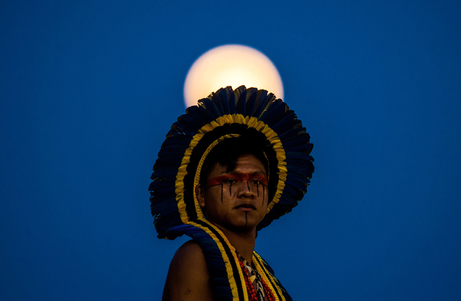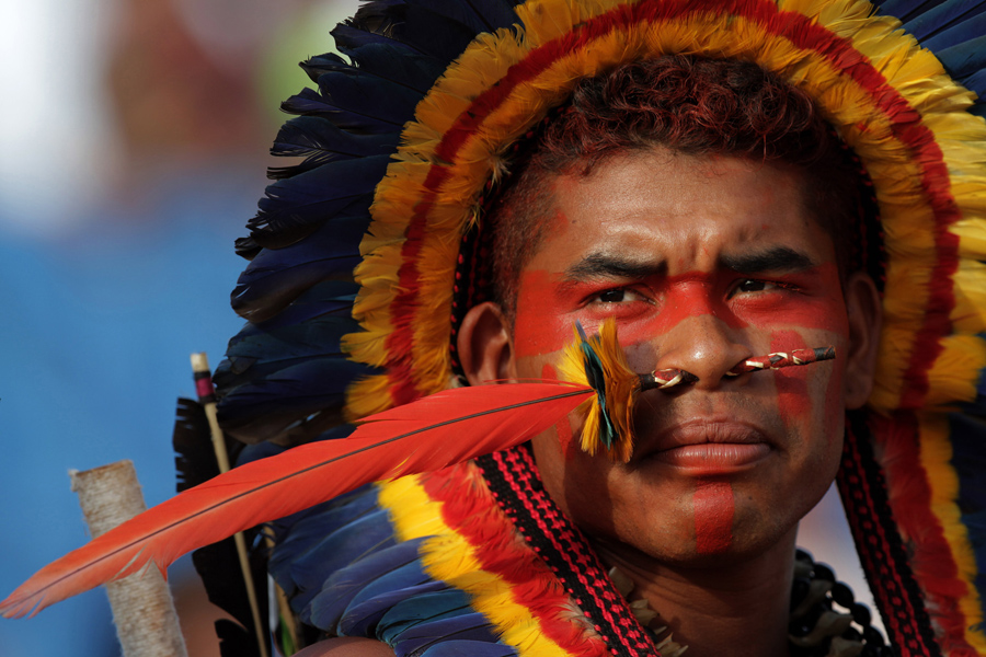 An indigenous man from the Pataxo tribe watches a relay race where the contestants carry tree trunks during the first World Games for Indigenous Peoples on October 27, 2015.Ueslei Marcelino / Reuters
