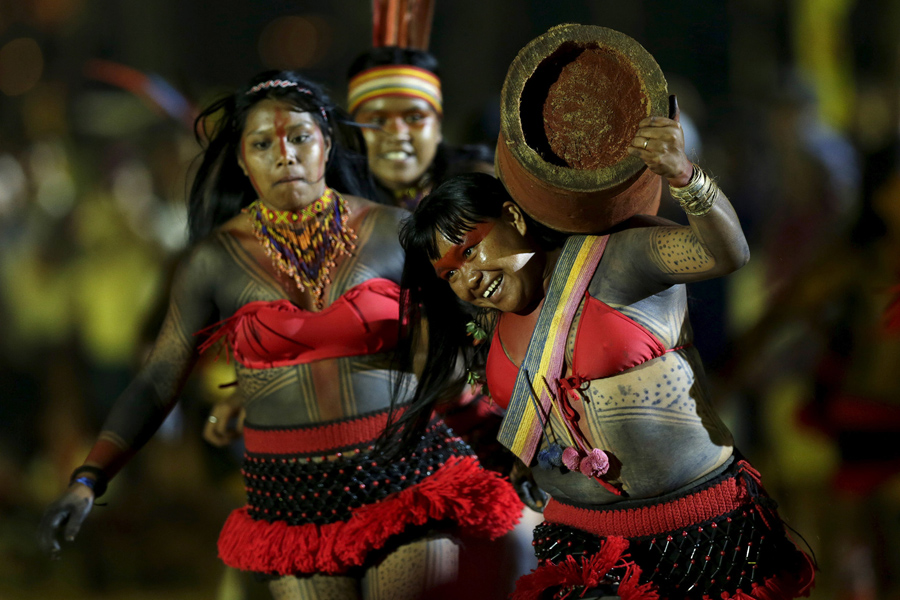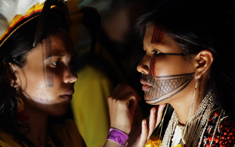 Women from the Kayapo, left, and the Rikbaktsa ethnic groups take part in the parade of indigenous beauty at the World Indigenous Games on October 24, 2015.Eraldo Peres / AP