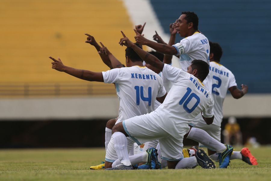 Athletes representing the Xerente Brazilian tribe celebrate a goal against the Pataxo Brazilian tribe team in a soccer match during the World Indigenous Games on October 23, 2015.Eraldo Peres / AP