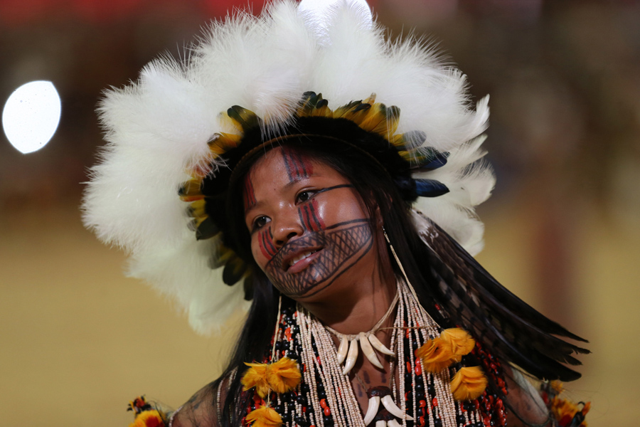 In this Friday, October 23, 2015 photo, people from various ethnic groups and countries dance during the opening ceremony of the World Indigenous Games, in Palmas, Brazil.Eraldo Peres / AP