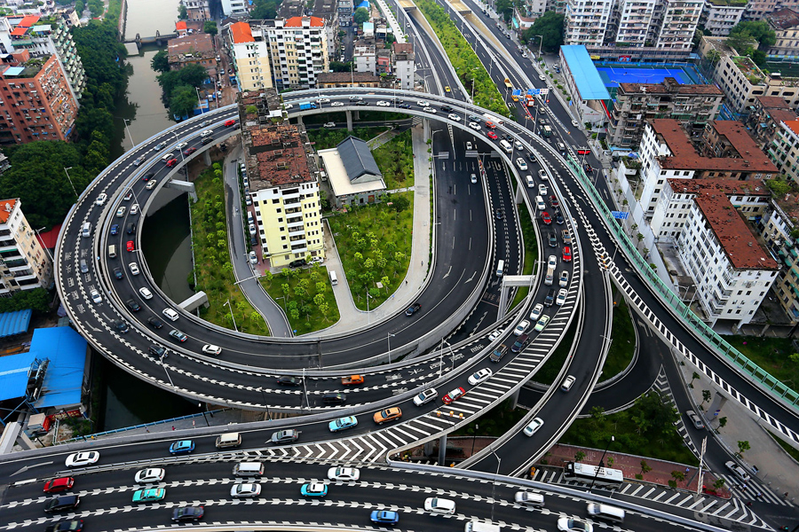 Aerial view of the two “nail houses” encircled by an overpass connecting the Zhoutouzui Tunnel in Guangzhou, in south China's Guangdong Province, on August 11, 2015. The houses were set to be demolished to create space for a bridge which would connect an elevated expressway to a newly opened underground tunnel, reported China News Service. While most of the residents accepted the relocation compensation, three families refused to move out of their homes. The construction workers had no other choice but to build an overpass around the lonely houses. The company has promised to surround the buildings with a noise barrier to make things more tolerable for the residents.Liu Jiao / Imaginechina / Corbis