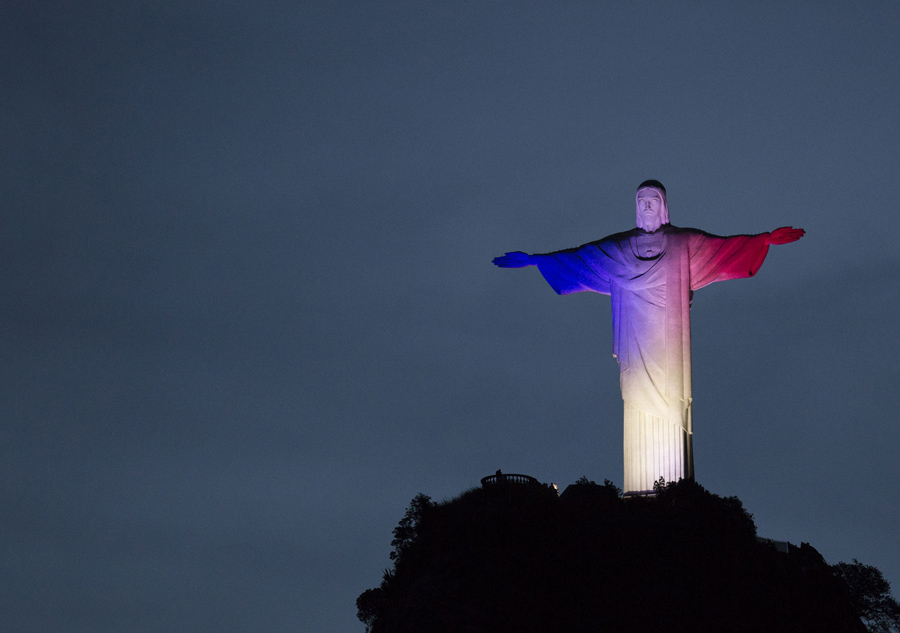 The Christ the Redeemer statue is lit with the colors of France's flag, in solidarity with France after attacks in Paris, in Rio de Janeiro, Brazil, on November 14, 2015.Leo Correa / AP