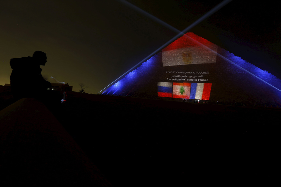 A man looks on as the Russian, Lebanese, and French flags are projected on one of the Giza pyramids, in tribute to victims from the respective countries, on the outskirts of Cairo, Egypt, on November 15, 2015.Amr Dalsh / Reuters