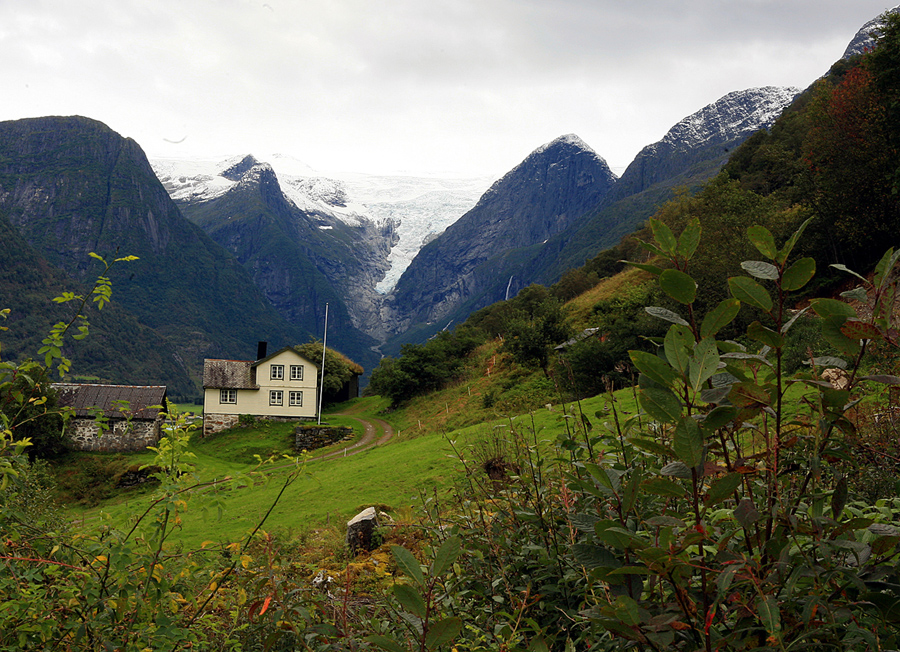 A view of Melkevollbreen Glacier, in Stryn, Sogn og Fjordane in 1888 and (click to fade) 2007. By comparing older photographs of farms with the same farm today, it is surprising to see how often old houses have been preserved. This is especially the case in the inner courtyard where storehouses and farmhouses are often the oldest still standing. The picture from Yri in Stryn shows that three of the five buildings from 1888 still exist. The stone walls of two of them are particularly easy to see. The house foremost in the picture was a mill, but is no longer there.CC BY-NC-ND Axel Lindahl / Oskar Puschmann / Skog og landskap bildearkiv / Tilbakeblikk