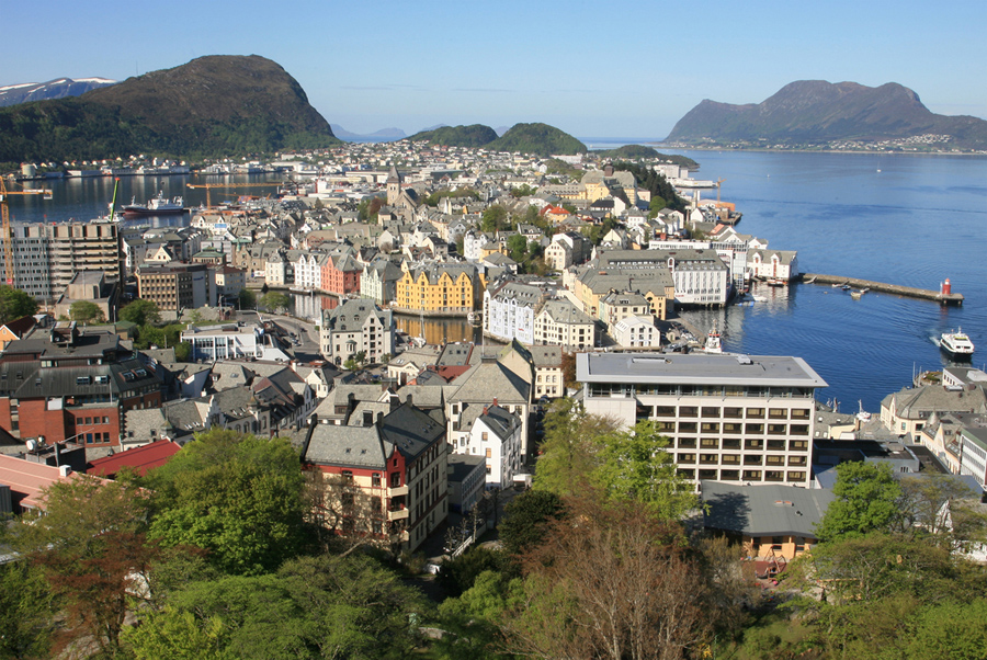 Town of Ålesund, Møre and Romsdal, seen in 1902, and again (click to fade) in 2011. On January 23 1904, Ålesund was hit by a terrible storm, followed by a devastating fire. The strong wind drove the flames from house to house and the town burned for almost 16 hours. In the region, about 850 houses were lost, and around 10,000 people became homeless. Within 3 to 4 years, the Ålesund as it is today rose from the ashes.CC BY-NC-ND Anders Beer Wilse / Oskar Puschmann / Skog og landskap bildearkiv / Tilbakeblikk