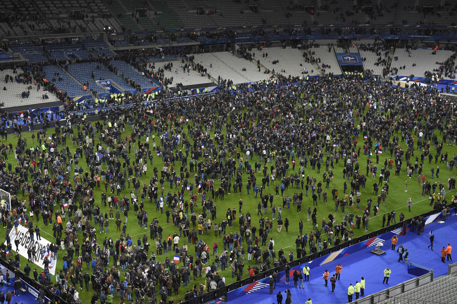Spectators gather on the pitch of the Stade de France stadium following the friendly football match between France and Germany on November 13, 2015, after a series of gun attacks occurred across Paris as well as explosions outside the national stadium.Franck Fife / AFP / Getty