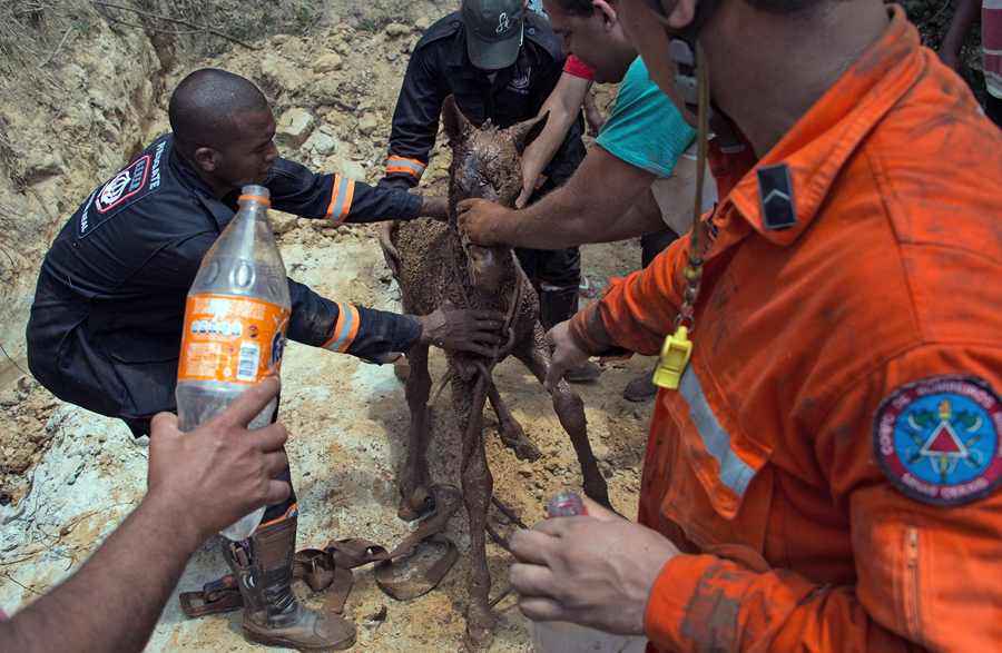 A rescue worker touches the face of a horse as they try to save it in Bento Rodrigues district, which was covered with mud after a dam owned by Vale SA and BHP Billiton burst on November 6, 2015.Ricardo Moraes / Reuters