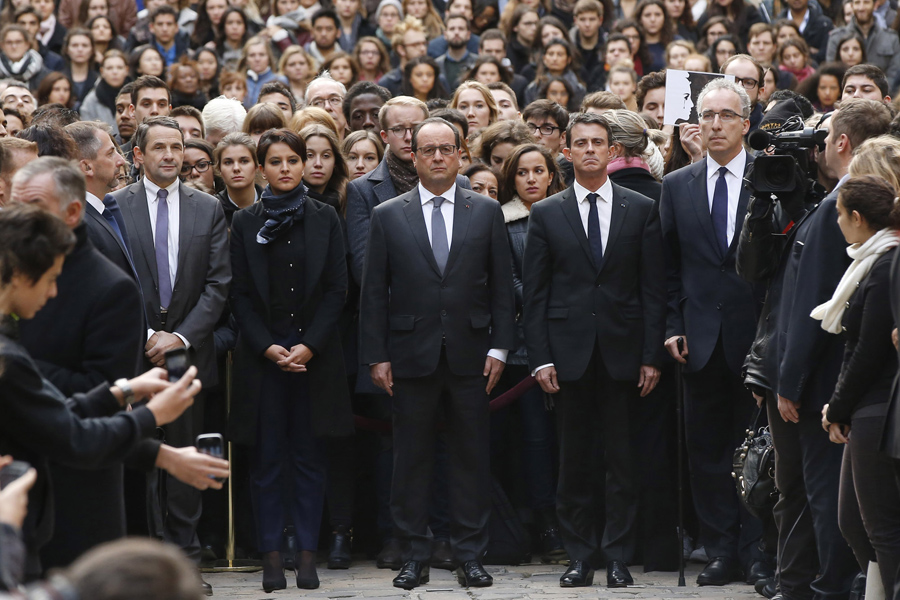 French President Francois Hollande, center, flanked by French Prime Minister Manuel Valls, right, and French Education Minister Najat Vallaud-Belkacem, left, stands among students during a minute of silence in the courtyard of the University in Paris, on Monday, November 16, 2015. A minute of silence was observed throughout the country in memory of the victims of last Friday's attack.Guillaume Horcajuelo / AP