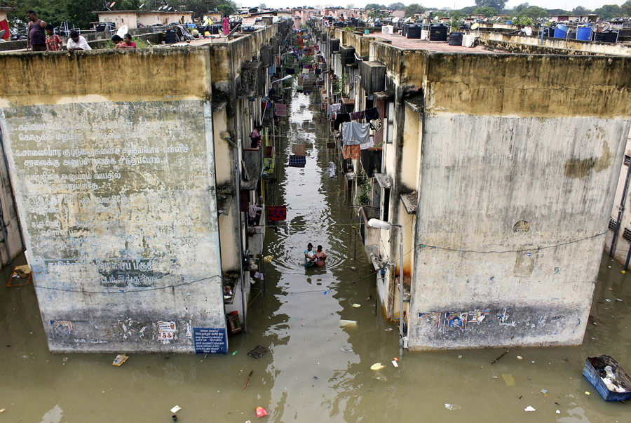 Indian people gather around a residential area that was flooded after heavy rains in Chennai on November 18, 2015. Large areas of the southern Indian city of Chennai have been flooded following days of heavy rain.AFP / Getty