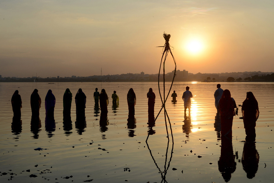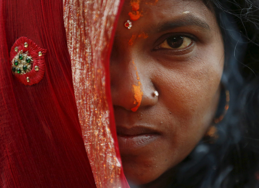 A face of a devotee covered with her cloth is pictured as she offers prayers to the rising sun during the “Chhat” festival in Kathmandu, Nepal, on November 18, 2015. Hindus in Nepal celebrate “Chhat,” a four-day festival that honors the sun god by praying at sunrise, and sunset, and seeking blessings for one’s family by giving offerings.Navesh Chitrakar / Reuters