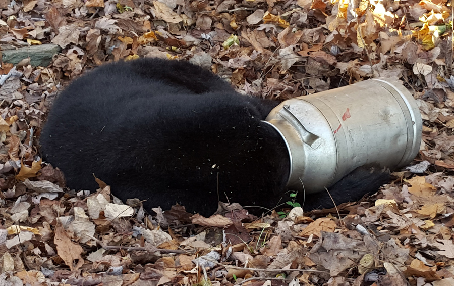 A black bear with its head stuck in a milk can near Thurmont, Maryland, on November 16, 2015. Maryland Department of Natural Resource workers tranquilized the bear before using and electric hand saw to cut the milk can off. The bear recovered consciousness and walked off unharmed.Maryland Wildlife and Heritage Service / Reuters