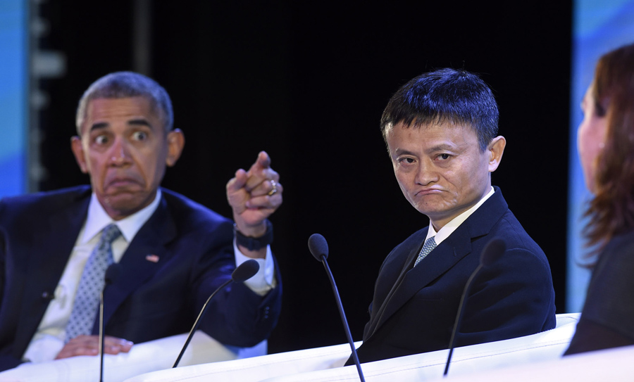 President Barack Obama jumps into a conversation to be a “matchmaker” and encourage Alibaba founder Jack Ma, center, and Filipina scientist Aisa Mijeno, to get into business together during a discussion at the CEO Summit in Manila, Philippines, on November 18, 2015.Susan Walsh / AP