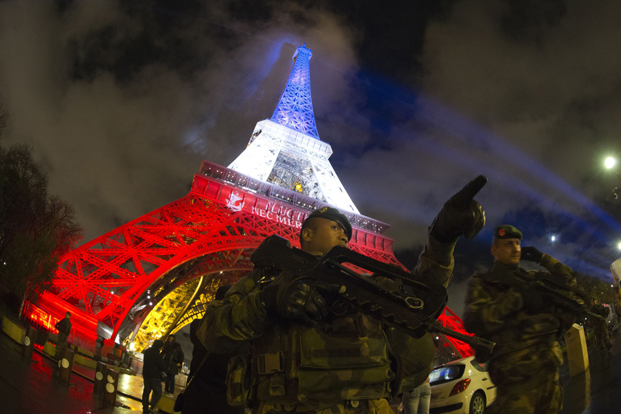 A French soldier enforcing the Vigipirate plan, France's national security alert system, on November 17, 2015, in Paris, in front of the Eiffel Tower, which is illuminated with the colors of the French national flag in tribute to the victims of the November 13 Paris terror attacks.Joel Saget / AFP / Getty