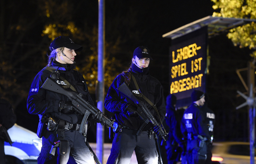 Heavily armed police stand outside HDI Arena in Hanover, Germany, in front of a board announcing that the game—a friendly Germany vs Netherlands match—was called off by police due to security reasons, on November 17, 2015.Fabian Bimmer / Reuters