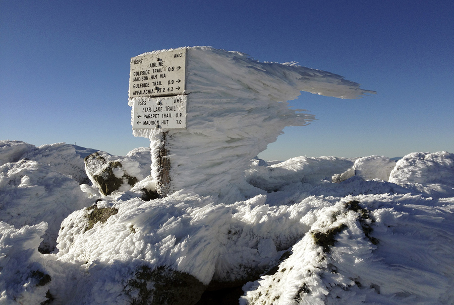 Rime ice extends several feet horizontally from a sign marking the summit of 5,774-foot Mount Adams, the second highest mountain in New England, on November 17, 2015, in northern New Hampshire. Monday's freezing fog and strong winds formed the rime ice, creating a winter wonderland above treeline in New Hampshire's aptly named White Mountains.Robert F. Bukaty / AP