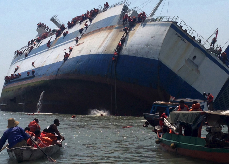 Passengers climb down the side of the ferry KM Wihan Sejahtera as it capsizes in Tanjung Perak Port, Surabaya, East Java, on November 16, 2015. The Tanjung Perak harbor master reported that 175 passengers and crew evacuated the ship and there were no casualties.Antara Photo Agency / Reuters