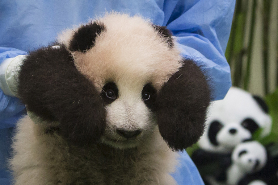 Malaysian zoo personnel handle a 3-month-old female giant panda cub at the Giant Panda Conservation Center at the National Zoo in Kuala Lumpur, Malaysia, on November 17, 2015.Joshua Paul / AP