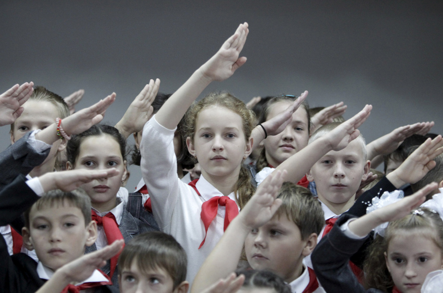 Children, wearing red neckerchiefs, a symbol of the Pioneer Organization, salute while posing for a picture during a ceremony for the inauguration of 18 newly-adopted members, at a local school in the southern settlement of Kazminskoye, in the Stavropol region of Russia, on November 19, 2015. Early pro-communist youth movements, which appeared in Russia after the 1917 Bolshevik revolution, were reformed into the Pioneer Organization of the Soviet Union. While the organization lost its dominance among students in post-Soviet Russia, some educational institutions and families still carry on this tradition.Eduard Korniyenko / Reuters