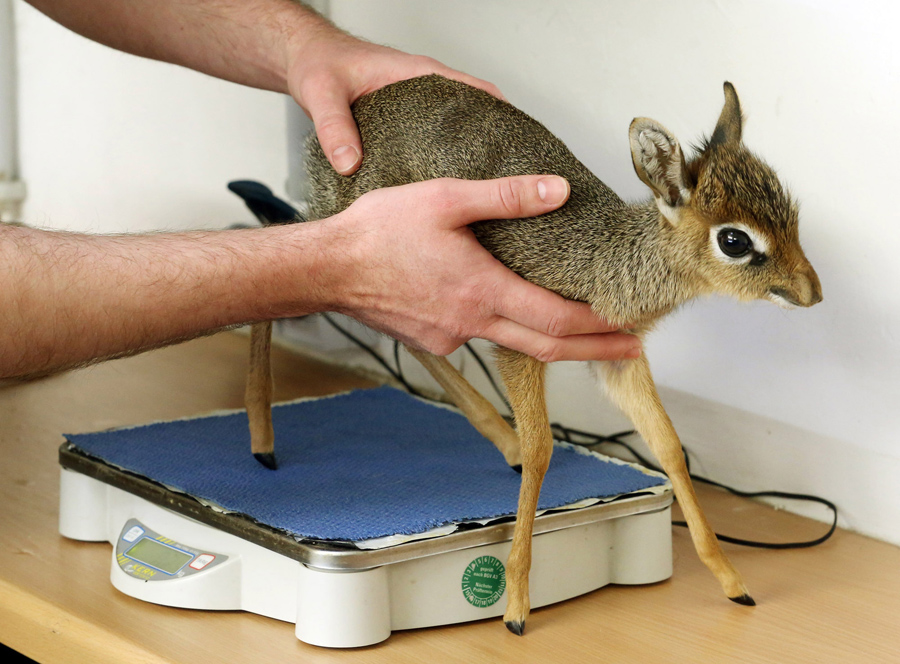 A 13-day-old Salt’s dik-dik walks off a scale in the Duisburg Zoo in Germany on November 11, 2015. This dik-dik is one of around 100 of its species in European zoos and is hand-fed by an employee as it was not accepted by its mother.Roland Weihrauch / AFP / Getty