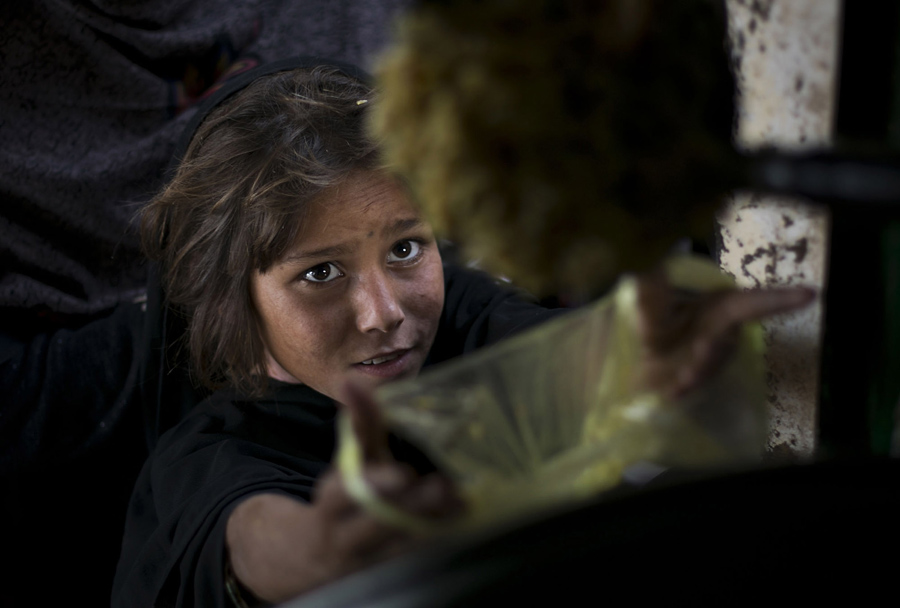 A poor Pakistani girl extends her plastic bag to receive free food for her family, distributed at a local shrine in the suburbs of Islamabad, Pakistan, on November 20, 2015. Pakistan also observed Universal Children's Day, which is marked annually by the United Nations and other nations.B.K. Bangash / AP