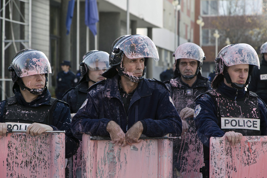 Kosovo police in riot gear are covered in pink paint after clashes outside Kosovo’s parliament building in the capital city, Pristina, on November 17, 2015. Kosovo opposition used tear gas and pepper spray inside parliament and pelted police with rocks and pink paint outside the building in another attempt to force the government to renounce recent deals with Serbia and Montenegro.Visar Kryeziu / AP