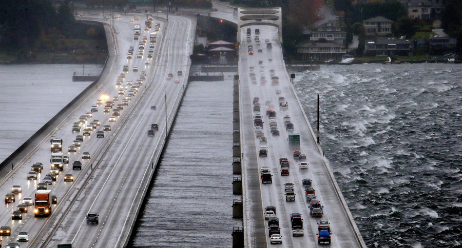 Eastbound traffic lanes, right, on Interstate 90 are dampened by wind-driven waves from the south as the floating bridge calms Lake Washington to the north, left, on November 17, 2015, in Seattle. Rain and high winds snarled during the morning commute in the Puget Sound area, and the Inland Northwest braced for severe weather.Elaine Thompson / AP