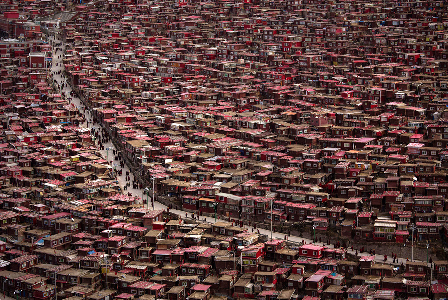 A Tibetan Buddhist nun walks past dwellings on her way to a chanting session as part of the annual Bliss Dharma Assembly at the Larung Wuming Buddhist Institute, on October 30, 2015.Kevin Frayer / Getty