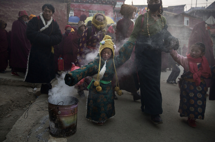 A Tibetan Buddhist girl walks through smoke from juniper burned as a blessing, on her way to a morning chanting session at the annual Bliss Dharma Assembly, on October 31, 2015.Kevin Frayer / Getty