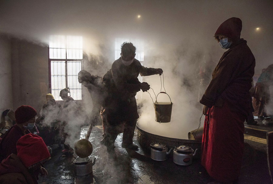 Tibetan Buddhist monks and nuns make tea from yak butter and milk before a morning chanting session at the annual Bliss Dharma Assembly at the Larung Wuming Buddhist Institute on October 31, 2015.Kevin Frayer / Getty