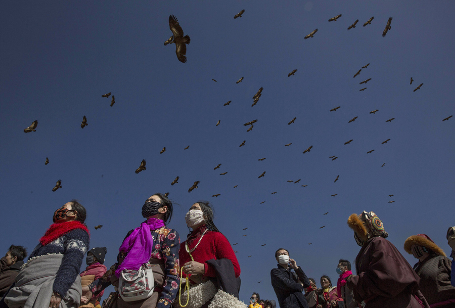 Vultures that consume the bodies of the dead in a traditional ritual called “sky burial” fly over a crowd at the Tibetan Buddhist site where the ritual takes place during a funeral near the Larung Wuming Buddhist Institute, on November 1, 2015.Kevin Frayer / Getty