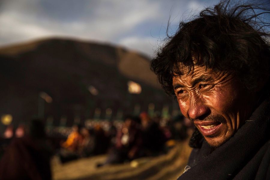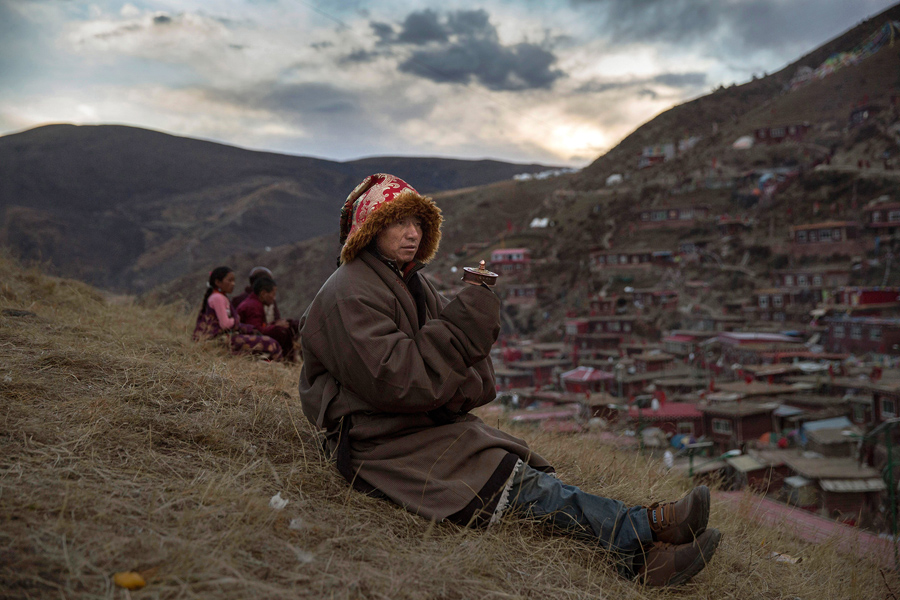 A Tibetan Buddhist nomad spins a mani khor-lo, or “prayer wheel,” as he sits on a hillside during the annual Bliss Dharma Assembly, on October 30, 2015.Kevin Frayer / Getty