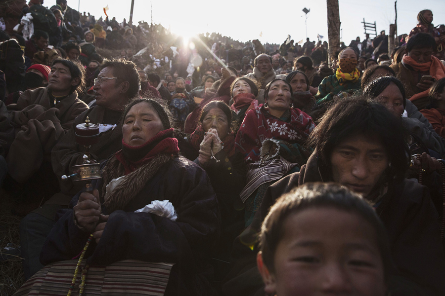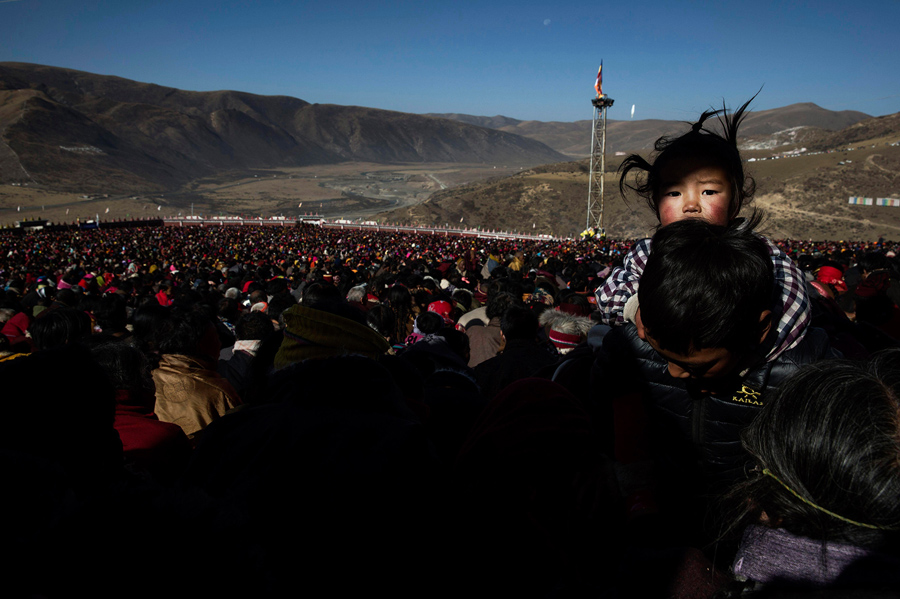 A Tibetan Buddhist woman carries her son in the crowd on a hillside overlooking a chanting session, at the annual Bliss Dharma Assembly, on November 1, 2015, in Sertar County.Kevin Frayer / Getty