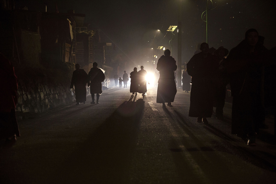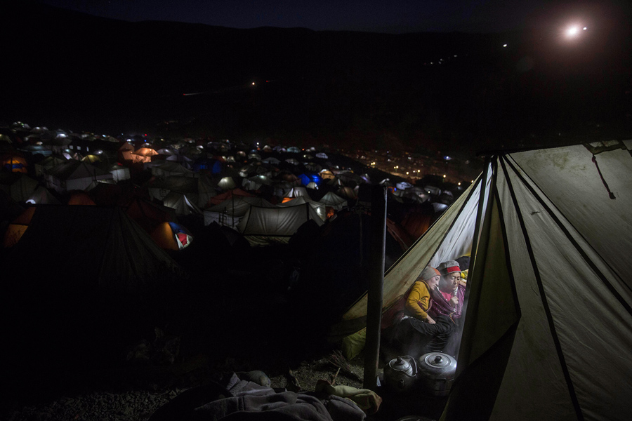 A Tibetan Buddhist nomad woman prepares tea at dusk following a chanting session as part of the annual Bliss Dharma Assembly at the Larung Wuming Buddhist Institute on October 31, 2015, in Sertar County, China.Kevin Frayer / Getty