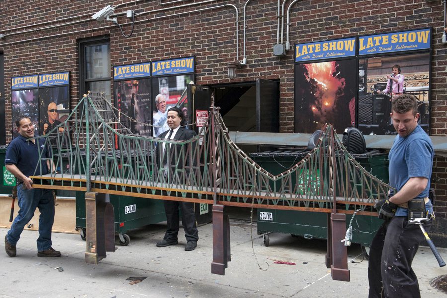 Stagehands carry set materials from the Late Show with David Letterman outside of the Ed Sullivan Theater in New York City on May 21, 2015, preparing for a rebuild of the stage for new host Stephen Colbert.Stephanie Keith / Reuters