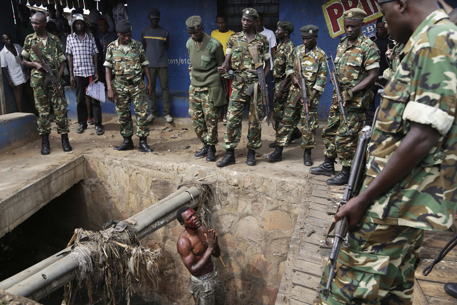 Jean Claude Niyonzima, a suspected member of the ruling party's Imbonerakure youth militia, pleads with soldiers to protect him from a mob of demonstrators after he came out of hiding in a sewer, in the Cibitoke district of Bujumbura, Burundi, on May 7, 2015. Niyonzima fled from his house into the sewer under a hail of stones thrown by a mob protesting President Pierre Nkurunziza's decision to seek a third term in office.Jerome Delay / AP