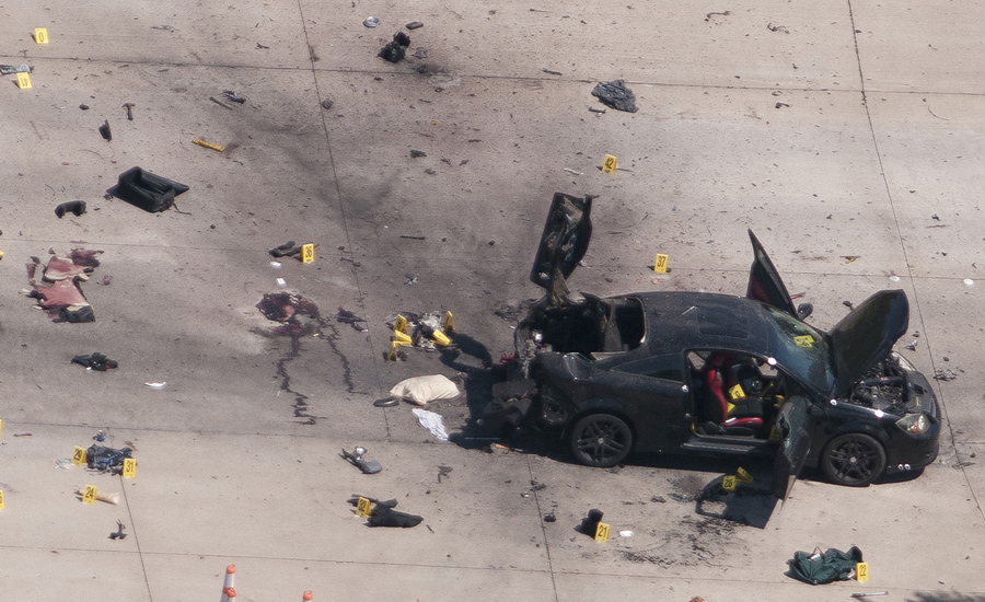 An aerial view shows the car that was used the previous night by two gunmen, who were killed by police, being investigated by local police and the FBI in Garland, Texas, on May 4, 2015. Texas police shot and killed two gunmen who opened fire outside an exhibit of caricatures of the Prophet Mohammad. The exhibit was organized by a group described as anti-Islamic and billed as a free-speech event.Rex Curry / Reuters