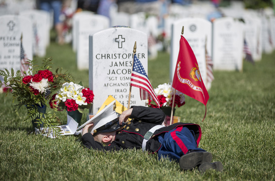 Christian Jacobs, 4, of Hertford, North Carolina, lies on the grave of his father, Christian James Jacob, during Memorial Day celebrations at Arlington National Cemetery in Arlington, Virginia, on May 25, 2015.Joshua Roberts / Reuters